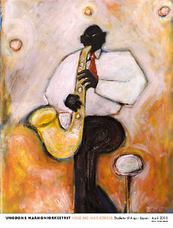 Den sorte saxofonist som blikfang til plakaten for Kolding Musikskoles Ungdoms Harmoniorkester studietur til Japan 2003