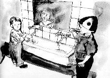 Sort-hvid akvareller fra bogen FORÆLDRESAMTALER fra forlaget Pædagogisk Forum, Århus 1995.